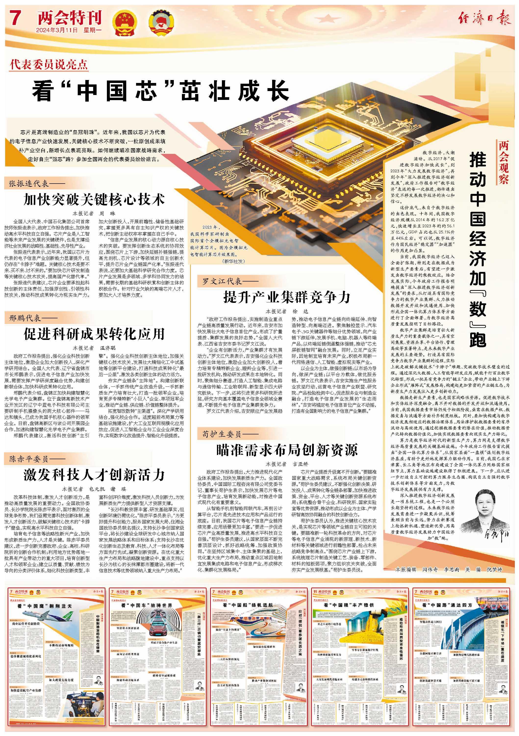 本文刊發于《經濟日報》2024年3月11日第7版兩會特刊 政府工作報告提出,大力推進現代化產業體系建設,加快發展新質生產力。全國政協委員,中國國際工程咨詢有限公司黨委書記、董事長茍護生表示,加快發展芯片等電子信息產業,培育發展新動能,對推進中國式現代化有重要意義。 從智能手機到智能網聯汽車,再到云計算平臺,芯片是先進技術應用和產品運行的底座。目前,我國芯片等電子信息產業鏈持續完善,應用場景更加豐富。“要進一步促進芯片產業高質量發展,推進高水平科技自立自強?!逼堊o生委員建議,從國家層面不斷完善頂層設計,抓好戰略統籌、加強政策協同?!霸趫猿謪^域集中、主體集聚的基礎上,優化重大生產力布局,推動重點區域因地制宜發展集成電路和電子信息產業,形成梯次化、集群化發展格局。” 芯片產業提質升級離不開創新?!耙闇蕠抑卮髴鹇孕枨螅到y布局關鍵創新資源。”茍護生委員建議,不斷強化創新決策、研發投入、成果轉化等全鏈條部署,加快推進政策、資金、平臺、人才等關鍵創新資源系統布局;系統整合骨干企業、科研院所、國家實驗室等優勢資源,推動形成以企業為主體、產學研智高效協同融合的科技創新合力。 茍護生委員認為,推進關鍵核心技術攻關,是實現芯片等領域產業鏈自主可控的關鍵。要瞄準新一輪科技革命的方向,對芯片等電子信息產業涌現的新原理、新技術、新材料等關鍵領域進行前瞻性部署,搶占未來戰略競爭制高點?!皣@芯片產業鏈上下游,系統梳理芯片制造關鍵工藝、裝備、零部件、材料的短板弱項,聚力組織攻關突破,全面夯實產業發展根基?!逼堊o生委員說。(經濟日報記者 吉亞矯) | |||||