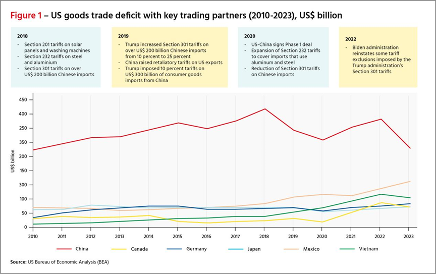 摘要 8月13日,辛里奇基金會貿易政策主管黛博拉·埃爾姆斯發表文章《特朗普如何塑造21世紀美國貿易政策》。文章指出,特朗普第一個任期以貿易為主導,主要是將美國的國家和安全利益置于前沿和中心位置,將貿易作為美國外交和戰略政策的武器,但現在已“根植”在華盛頓兩黨、兩院和長期政策制定中。因此,在評估美國貿易和經濟政策制定方式的急劇轉變時,有五點轉變值得注意,其始于特朗普政府時期,并在拜登政府時期延續。 正文 隨著即將到來的美國總統選舉的民調結果愈發緊張,貿易觀察人士正密切關注唐納德·特朗普總統第一任期的經驗教訓以及他重返白宮的計劃。特朗普代表著與過去美國貿易政策做法的徹底決裂,但他對國內普遍情緒的利用程度足夠深,以至于他的許多政策在拜登總統任期內得以延續,而且無論誰入主白宮,他的政策似乎都將繼續下去。 貿易和經濟是特朗普議程的核心。多年來,他對許多其他議題的立場發生了變化,但他始終專注于貿易。這是他擔任總統之前就存在的一個目標。1987年,他在《紐約時報》上刊登了一整頁廣告,抗議當時他認為不公平的貿易行為,尤其是日本的貿易行為,他認為這種行為削弱了美國。這已經預示了他后來擔任總統時將采取的提高關稅的舉措。 特朗普就任總統后,貿易政策成為“特朗普政策指南針的四個要點”之一。事實證明,這一貿易指南針非常耐用,他和他的團隊對美國政策做出的許多改變在他離開白宮后仍然有效。特朗普政府為重新定位美國長期政策制定而采取的立場現在似乎已“根植”在華盛頓的決策中。 在評估美國貿易和經濟政策制定方式的急劇轉變時,有幾點值得注意,這種轉變始于特朗普時期,并在拜登時期基本延續。這些包括 1.推動白宮和行政部門的貿易政策; 2.重新使用單邊貿易工具; 3.重新制定貿易政策以適應經濟戰; 4.與經濟盟友的關系發生變化; 5.貿易利益與國家安全利益相混淆; 6.全球貿易體系多邊規則制定削弱。 特朗普在實施貿易議程方面之所以有效,得益于美國政治制度的特殊性。盡管美國憲法明確賦予國會管理稅收(以及關稅)的權力,但美國總統和行政部門在貿易和經濟問題上仍有很大的回旋余地。自2017年1月,特朗普上任第一天單方面宣布退出跨太平洋伙伴關系協定(TPP)以來,美國貿易政策在很大程度上是由白宮推動的,國會對此沒有施加太大壓力。 在拜登政府的領導下,貿易政策繼續由行政部門制定。拜登和特朗普一樣,繞過國會就貿易和經濟問題發布了一系列行政命令。他進一步將貿易政策制定權集中在白宮,而美國貿易代表辦公室(USTR)的作用則大大受限。美國商務部在印太經濟繁榮框架(IPEF)中發揮了核心作用,該框架要求調整美國國內政策流程,以允許美國商務部參與國際談判。 其次,特朗普選擇了里根政府的貿易律師兼高級貿易官員羅伯特·萊特希澤擔任美國貿易代表,萊特希澤對美國政治和政策制定體系有著豐富的知識和經驗。萊特希澤與彼得·納瓦羅和威爾伯·羅斯等其他顧問一起制定了許多美國法規和政策,這些法規和政策在很大程度上已經擱置了數年甚至數十年。萊特希澤被任命為美國貿易代表后,得以重啟國內工具,例如有關不公平貿易行為的第301條款或有關國家安全的第232條款。 同樣,拜登政府繼續使用了許多這些具體的工具。對鋼鐵和鋁征收的232條款關稅仍然有效,對中國產品的301條款關稅也是如此。拜登于2024年7月20日通過公告宣布了新的鋼鐵232條款申請。2024年8月,還對一組新的中國產品征收了301條款關稅。 特朗普最初貿易議程的第三個重要領域是對貿易政策目的的重大重新評估。301條款或232條款等工具被用來實現其目標,其根源在于美國正在經歷一場經濟戰。特朗普的論點被萊特希澤巧妙運用和實施,他認為過去的做法尤其是貿易協定的使用以及他們認為過去政府未能妥善執行這些協定的做法,加速了美國的衰落。 雖然拜登執政期間大部分政策調整都得以實施,但特朗普的一項關鍵指標被取消了。特朗普將雙邊貿易逆差的規模視為衡量美國是否從貿易中獲益的標準。與美國存在大量商品貿易逆差的國家被認為采用了不恰當的貿易做法。 圖1和圖2顯示,盡管特朗普重新調整貿易政策并重點關注雙邊貿易逆差,但除非疫情扭曲趨勢,否則美國貿易流并沒有持續響應特朗普政府的政策。 特朗普對貿易政策的調整包括改變與合作伙伴和盟友的關系。特朗普在與外國政府,包括關鍵人物打交道時被稱為交易型。 特朗普對貿易和經濟領域長期存在的聯盟和伙伴關系表現出的普遍漠視也意味著,他的大部分努力都是單方面的,而不是通過建立志同道合的合作伙伴聯盟來實現的。美國單方面裁定不公平貿易行為的301條款就是一個很好的例子。在特朗普執政之前的幾十年里,301條款一直存在,但美國政府并未使用,因為它被多邊主義取代,成為應對貿易挑戰的更強大、更持久的解決方案。 特朗普和301條款復活的策劃者萊特希澤則沒有這樣的顧慮。301條款被用來作為對中國進口產品分四批提高關稅的理由,自2018年3月開始。多種產品的關稅最高上漲了25%。 2018年1月,美國對中國商品的平均關稅為3.1%。兩年內,平均關稅躍升至21%,隨后在與中國達成第一階段雙邊協議后,于2020年3月略微下降至19.3%。在同一時期,中國將對美國進口商品征收