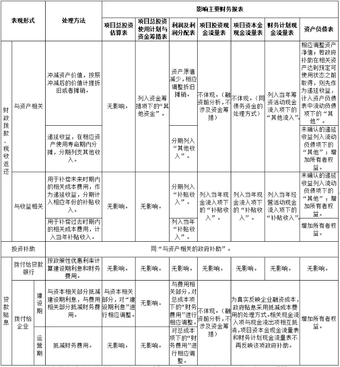 投資項目財務評價中 政府性資金的處理方法研究 張蓉 張銳 曹玫 摘要:對于部分投資項目而言,政府性資金是其建設期的重要資金來源,是運營期的生存發展保障,對降低項目運行成本、提高財務盈利水平、提升公共產品規模、質量和效率、激發社會投資活力等方面有積極作用。鑒于政府性資金在我國投資項目財務評價中的重要性和復雜性,本文以財務評價理論為基礎,既有效銜接相關會計準則,又兼顧財務評價預測性特點,提出了政府性資金在財務報表中的處理方法,旨在為投資項目財務評價提供規范性、有效性和實務性參考。 關鍵詞:投資項目;財務評價;政府性資金 一、引言 政府性資金是政府通過對國民收入的再分配,干預、調節市場經濟和社會活動的一項工具,在引導社會投資、扶持重點產業、推進結構調整、優化社會資源、增強經濟活力等方面發揮著重要作用,是推動經濟和社會高質量跨越式發展的積極力量。2019年4月,國務院公布《政府投資條例》(國務院令第712號),2014年至2021年國家發展改革委先后發布《中央預算內直接投資項目管理辦法》(2014年國家發展改革委第7號令)、《中央預算內投資補助和貼息項目管理辦法》(2016年國家發展改革委第45號令)、《國家發展改革委關于規范中央預算內投資資金安排方式及項目管理的通知》(發改投資規〔2020〕518號)、《中央預算內投資資本金注入項目管理辦法》(2021年國家發展改革委第44號令)等一系列政策文件,進一步加強和改進政府性資金及相關項目的管理工作。可見,通過政府性資金實現宏觀調控和促進發展的目標,是我國現階段社會主義市場經濟體制的一個基本特征。 隨著我國供給側結構性改革和投融資體制改革等中國特色社會主義市場經濟實踐的逐步深化,投資項目的投融資方式、運營模式不斷創新,政府性資金呈現以下特點: 第一,使用范圍廣泛。政府性資金適用于非經營性項目和符合國家宏觀調控要求的經營性項目,涉及各行業、各類型和各主體的投資項目。根據《政府工作報告》,2015年中央預算內投資4576億元,2024年中央預算內投資安排7000億元,平均年增長率4.4%。 數據來源:2015-2024年《政府工作報告》 圖1 2015-2024年中央預算內投資規模 第二,支持方式多元。政府性資金主要包括政府資本性投入、政府購買服務支付對價和政府補助三種類型,每種類型還細分多種支持方式,同一投資項目可涉及單一或多種政府性資金支持。 第三,資金性質復雜。不同類型、不同支持方式、不同使用條件下,政府性資金的內涵、特點、使用范圍及其作用均不一樣,在投資項目財務評價中的處理方法和科目列項等也不相同。 政府性資金的上述特點給投資項目財務評價工作帶來了一定難度。雖然可以借鑒會計準則的基本原則,但由于會計與財務評價在目的作用、理論體系、工作依據、數據特征等方面均有所不同,以致財務評價實踐中缺乏對政府性資金的處理細則,出現了“理解認識不同” “分類界定不同”“處理方法不同”等一系列問題,影響了投資項目決策的準確度和可靠度。本文從實踐出發,在系統梳理政府性資金的分類、內涵、特點、適用范圍以及對財務評價影響的基礎上,研究提出各類政府性資金在財務評價中的處理方法,以期能進一步提高投資項目決策的科學性和可靠性,充分發揮各類政府性資金的作用。 二、政府性資金的概述 (一) 政府性資金的概念 廣義的政府性資金是指政府運用公權力征集、管理、使用的所有資金[1]。本文中的政府性資金是指以投資項目為載體,政府根據項目性質、建設主體、運營模式等,采用不同投入方式在項目全生命周期內給予的資金支持,以發揮政府性資金在實現宏觀調控、促進經濟社會全面協調可持續發展中的作用。非貨幣性資產投入不在本文中進行討論。 實務工作中,易混淆政府性資金和政府投資資金的概念。根據《政府投資條例》,政府投資資金應當投向市場不能有效配置資源的社會公益服務、公共基礎設施、農業農村、生態環境保護、重大科技進步、社會管理、國家安全等公共領域的項目,安排方式包括直接投資、資本金注入、投資補助、貸款貼息等。其中,采用直接投資和資本金注入方式的政府投資資金屬于政府資本性投入;貸款貼息屬于政府補助。投資補助在財務評價中的處理方式主要有兩種。一是屬于政府資本性投入,對于我國境內設立的國有及國有控股企業,投資補助增加資本公積或者實收資本。二是屬于與資產相關的政府補助,對于我國境內設立的企業,投資補助沖減資產賬面價值或確認為遞延收益。本文綜合考慮適用范圍等因素,投資補助作為政府補助處理。 (二)政府性資金的分類和特點 按照政府宏觀調控需要以及投資項目的項目性質、運營模式和盈利能力,政府性資金主要包括政府資本性投入、政府購買服務支付對價和政府補助等類型。 1.政府資本性投入 政府資本性投入是政府以投資者身份投入的資本,屬于所有者權益,其中政府履行出資人職責、享有出資人權益,具備有償性和享有投資者權益回報的特點,包括政府直接投資、資本金注入兩種政府投資方式。 直接投資,是指政府安排政府投資資金投入非經營性項目,并由政府有關機構或其指定、委托的機關、團體、事業單位等作為項目法人單位組織建設實施的方式。 資本金注入
