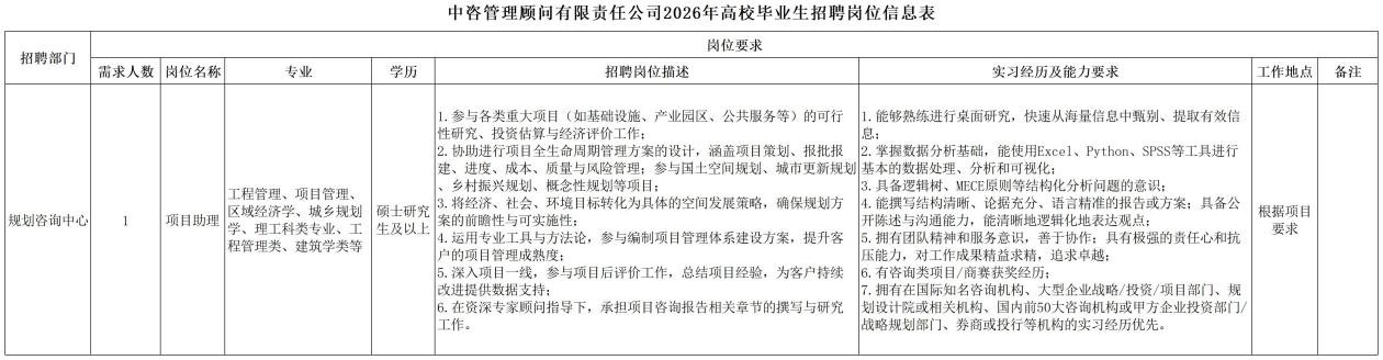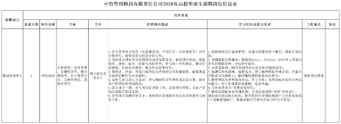 一、公司簡介 中咨工程管理咨詢有限公司(簡稱中咨管理)成立于1989年,是中國國際工程咨詢有限公司的核心骨干子公司,注冊資金1.55億元。現有各項資質證書持證2800余冊,中高級職稱比例超50%。 中咨管理公司是國內從事工程管理類業務最早、規模最大、行業最廣、業績最多的企業之一,具有工程咨詢甲級資信、工程監理綜合資質以及設備、公路工程、地質災害防治工程、人民防空工程等多項專業監理甲級資質,并列入政府采購招標代理機構和中央投資項目招標代理機構名單。業務涵蓋工程前期咨詢、項目管理、項目代建、招標代理、造價咨詢、工程監理、設備監理、設計優化、工程質量安全評估咨詢等項目全過程咨詢服務,涉及房屋建筑、交通、石化、水利、電力、冶煉、礦山、市政、生態環境、通信和信息化等多個行業。業務遍布全國及全球近50個國家和地區,累計服務各類咨詢管理項目超過1萬個,涉及工程建設投資近5萬億元。曾榮獲56項中國建設工程魯班獎、15項中國土木工程詹天佑獎、64項國家優質工程獎、23項中國鋼結構金獎以及各類省級或行業獎項500余項。 經過30余年的不懈努力,我們積累了豐富的工程管理經驗,為各類工程建設項目保駕護航,“中咨管理”品牌成為行業的一面旗幟。我們崇尚簡單、包容、共享的理念,秉持創造價值、貢獻社會的使命和專業創造精品、價值成就客戶的核心價值觀,為成為全過程工程管理咨詢的領先者而奮斗。優秀的你值得更好的平臺,加入我們,攜手共創新篇章! 二、應聘條件 (一)2026年全日制本科及以上應屆畢業生。 (二)年齡要求:本科生26周歲及以下(2000年1月1日后出生),碩士研究生30周歲及以下(1996年1月1日后出生)。 (三)在校就讀期間無在職工作經歷,無社保繳納記錄和派遣落戶記錄。 (四)成績優秀,人品端正,積極進取,愿與公司共改革、奮進。 (五)具備扎實的專業理論知識和良好的溝通能力,實踐能力較強。 (六)熟練使用各類辦公軟件。 (七)簡歷需注明出生日期、生源地(即入學前戶籍所在地)。 三、應聘程序 發布招聘公告→簡歷投遞→簡歷篩選→筆試→面試→確定人選并公示→發放錄用通知。 四、崗位信息 五、報名方式 本次招聘報名采取在線填報方式進行:應聘者請使用Chrome內核瀏覽器(如:Chrome瀏覽器、360瀏覽器、百度瀏覽器、搜狗瀏覽器、UC瀏覽器等)登錄網站報名,網站鏈接:https://hcmcloud.ciecc.com.cn/recruit/#/index 或使用手機掃描二維碼: 中咨工程有限公司 一、 公司簡介 中咨工程有限公司成立于2010年,是中國國際工程咨詢有限公司(簡稱中咨公司)的控股子公司,由中咨公司和中國廣核電力股份有限公司合資成立。 公司作為中咨公司工程管理業務板塊的核心成員,主營業務為全過程工程管理(咨詢)服務業務,包括全過程中的各節點業務(1+X),業務范圍涉及石化、核電、冶金、交通和民用市政等多個領域行業工程項目的前期咨詢及咨詢管理、勘察管理、設計管理、監理、采購管理、造價咨詢、建造過程管理、項目管理(IPMT、PMC等)、項目代建和技術服務等。 公司以為國家、社會和股東創造價值為己任,以兩大股東提供的廣闊市場機遇和成熟先進的管理體系為發展驅動力,通過積極參與市場競爭,努力培育公司核心競爭能力,打造一支特別能戰斗的具有復合型人才的專業化隊伍,矢志發展成為具備承接大中型全過程工程管理(咨詢)服務業務能力的、具有國際競爭力的工程公司。 二、 應聘條件 (一)2026年全日制本科及以上應屆畢業生(部分崗位碩士研究生學歷),在校就讀期間無在職工作經歷,無社保繳納記錄和派遣落戶記錄,學習成績優良。 (二)良好的語言表達能力和溝通能力,執行力強,學習能力強,協作能力強。 (三)身體健康,具有良好的職業道德修養,具有較強的責任心。 (四)熟練使用常用辦公軟件,具有一定的文字功底。 (五)無違規違法記錄,無不良嗜好,身體素質好,能吃苦耐勞,能承受較大的工作壓力。 三、 招聘程序 發布招聘公告→簡歷篩選→資格審查→綜合能力測評→面試→確定人選并公示→發放錄用通知→入職。 四、 崗位信息 五、 報名方式 本次招聘報名采取在線填報方式進行:應聘者請使用Chrome內核瀏覽器(如:Chrome瀏覽器、360瀏覽器、百度瀏覽器、搜狗瀏覽器、UC瀏覽器等)登錄網站報名,網站鏈接:https://hcmcloud.ciecc.com.cn/recruit/#/index 或使用手機掃描二維碼: 中咨海外咨詢有限公司 一、公司簡介 中咨海外咨詢有限公司是中國國際工程咨詢有限公司所屬二級子公司,于1988年成立,經過30多年發展,為各級政府、企事業單位提供了萬余項咨詢服務,在國內咨詢領域具有一定知名度和較高信譽,具備較好的發展基礎。2021年入選國資委“管理標桿”企業,2022-2025年連續4年蟬聯國資委“雙百行動標桿”企業。 公司主要從事戰略謀劃、投資策劃、全過程咨詢以及規劃設計和建設投資管理經營五大業務。善于謀劃策劃創造發展新優勢,努力成為工程建設領域原創思想策源地;善于科學設計項目功能成本方案,致力成為國內優化設計領域先行者;善于系統提供區域發展整體解決方案,努力成為國內有影響力的具有研究特質的咨詢設計企業。公司為國家高新技術企業,擁有工程咨詢行業綜合甲級資信、15項專業專項甲級資信;公路、建筑、市政行業7項專業甲級設計資質;市政行業2項專業乙級設計資