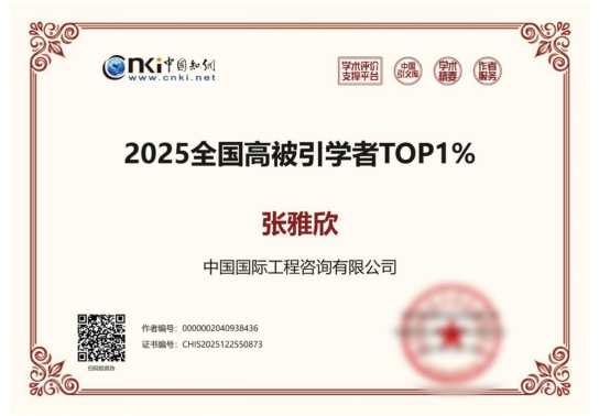 太贊了,TOP1% !公司青年科技人才實力登榜,這份榮耀超有分量! 近日,中國知網(CNKI)發布“2025全國高被引學者”榜單。公司資源與環境業務部(碳達峰碳中和協同推進中心,以下簡稱“資環部”)青年員工、中咨卓越工程師學院培育的優秀人才張雅欣,憑借其在資源環境與“雙碳”領域的亮眼研究成果,成功入選該榜單最高層級——“2025高被引學者TOP1%”。 張雅欣作為公司自主培養、淬煉成長的青年科技人才,這份榮譽的獲得,不僅是對其個人研究能力的高度認可,也是中咨智庫學術影響力和社會影響力的有力彰顯,體現了公司高端智庫建設與青年人才培養的顯著成效。 榮譽證書 “全國高被引學者”評選基于中國知網學術文獻大數據,重點考察學者研究成果的實際引用率和綜合學術貢獻度,是國內具有較高公信力的學術評價體系之一。“TOP1%”榜單作為該評選的最高榮譽,旨在遴選近十年來綜合學術影響力位居該領域全國前1%的學者,入選標準嚴格、比例極低,是衡量科研人員研究水平的重要標志。對于成功入選,張雅欣難掩激動,但也說出了肺腑之言:“沒有中咨公司的平臺,我很難取得這樣的成績。” 栽下梧桐樹,引得鳳凰來。張雅欣2023年博士畢業于清華大學環境學院,同年11月進入公司博士后科研工作站,因表現優異,于2025年11月出站后入職公司資環部。談到這段從學校到職場的進階,張雅欣說:“讀博期間,我就對中咨公司充滿向往,經過到公司兩年多的歷練,我更慶幸,我的選擇超出期待!”她說中咨公司給予了她許多養料:“在這里,我積累了豐富的項目實踐經驗,還能接觸各行各業的專家大咖,同時獲得參與政策研究的機會,這些為我開展課題研究提供了豐厚沃土。” “我的研究課題都是從業務實踐中來的。”張雅欣娓娓道來。工作期間,她充分把握公司“宏觀戰略、中觀產業、微觀項目”的“三位一體”優勢,堅持從項目實踐中提煉科學認知,再用科學認知反哺項目實踐,推動智慧的火花在中咨平臺競相綻放。 學術研究方面,張雅欣以核心作者身份發表論文十余篇,累計被引用量超過1300次。2025年,她申報的《“碳排放雙控”體系下地方碳排放預算管理模型與應用研究》研究課題,成功獲批中國博士后科學基金面上項目,實現公司博士后工作站申報國家級基金的歷史性突破。政策實踐方面,她的博士后課題研究成果《碳排放統計核算方法與經濟模型研究:基于地方碳排放預算管理的視角》陸續在多地碳排放雙控和碳預算管理咨詢項目中落地應用,取得良好實踐成效。 張雅欣(左四)參加公司2025年度博士后出站考核 長期以來,公司依托中咨卓越工程師學院、博士后科研工作站等平臺,持續完善高層次專業人才引育用留機制,為青年科技人才聚焦國家戰略、開展前沿研究提供了有力支撐。公司智庫研究與咨詢實踐雙輪驅動,推動構建智庫建設和全過程咨詢協同并進的良好格局。 展望未來,公司將堅持“科技是第一生產力、人才是第一資源、創新是第一動力”的鮮明導向,努力打造高端戰略型人才的聚集地,加快建設國家高端智庫和世界一流咨詢機構,為推進中國式現代化貢獻更多智慧和力量。 | |||||